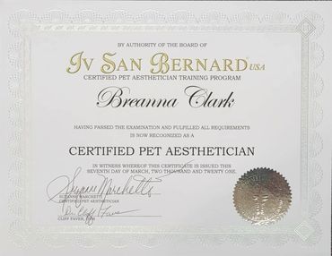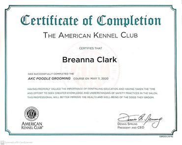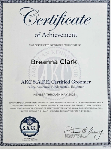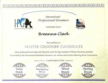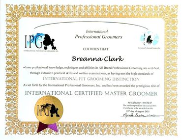 I am a Certified Master Groomer through International Professional Groomers as well as a Certified Pet Esthetician through Iv San Bernard. Both of which have given me the ability to better understand a pet's skin and coat needs to help them feel their best to understanding the balance and structure of their body shape and breed standards to help them look their best. For the safest care of your pets I have also become an AKC S.A.F.E. Certified Groomer along with being CPR and First Aid Certified through PetTech.
